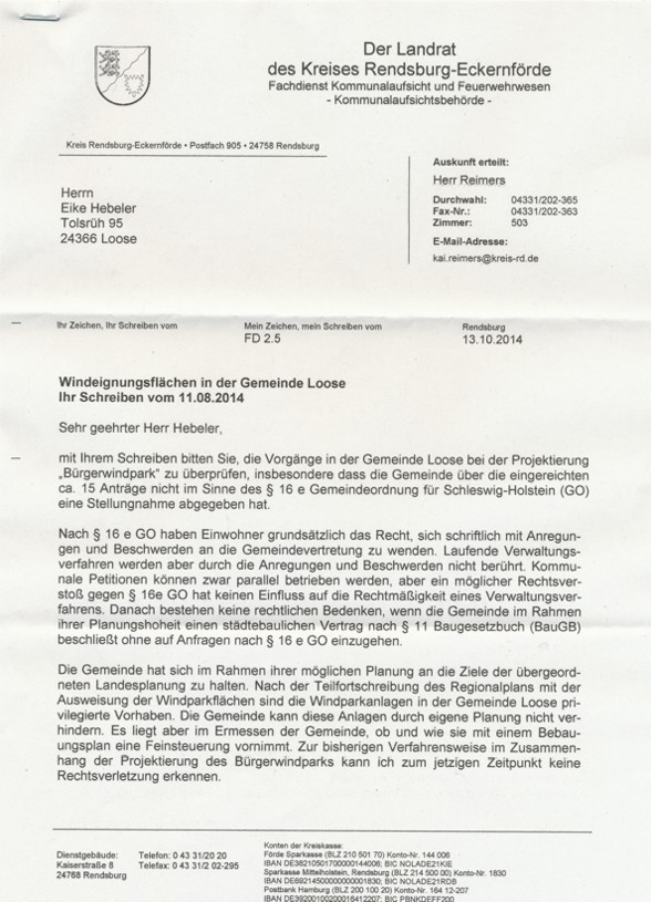 Rechtmäßigkeit der Vorgänge in Loose bei der Projektierung des "Bürgerenergieparks"