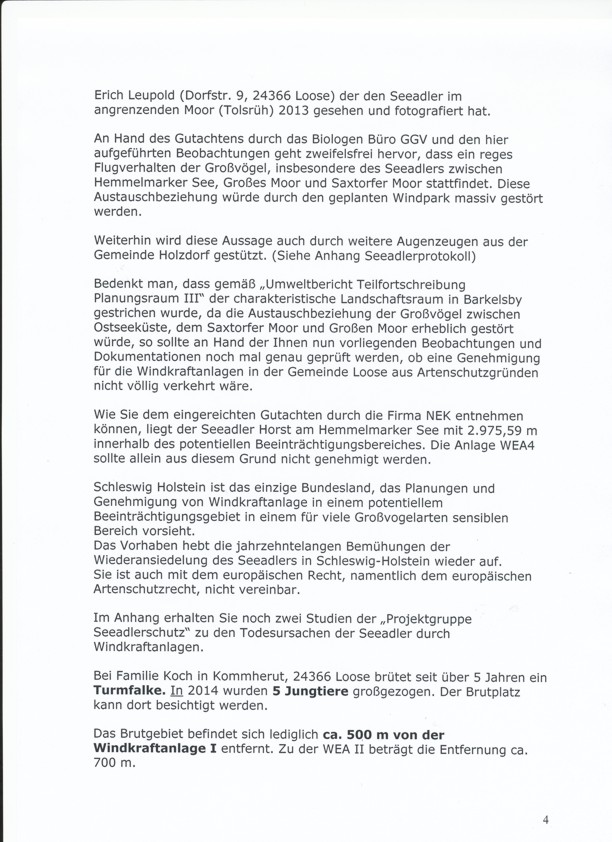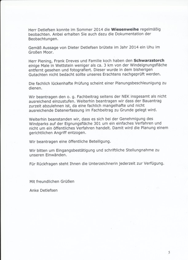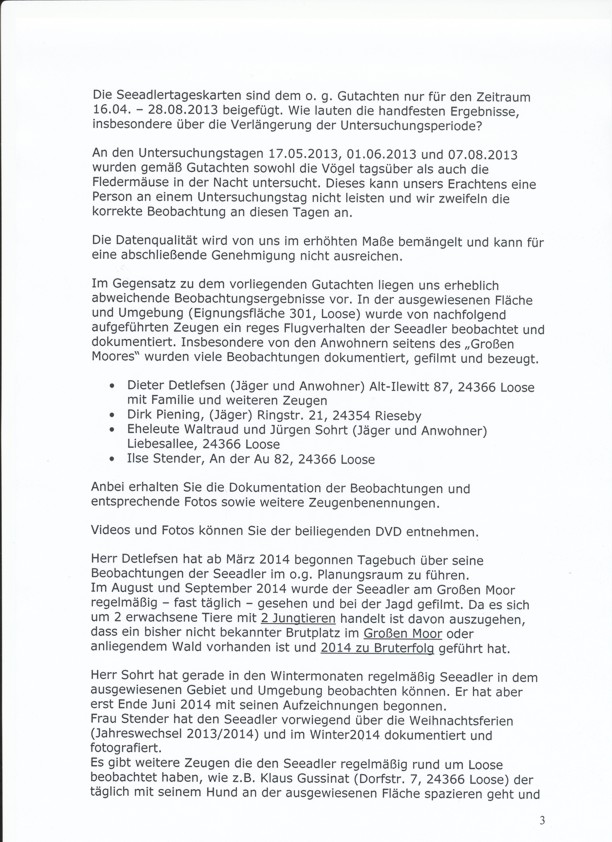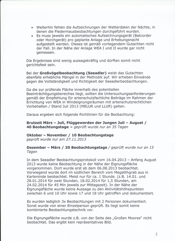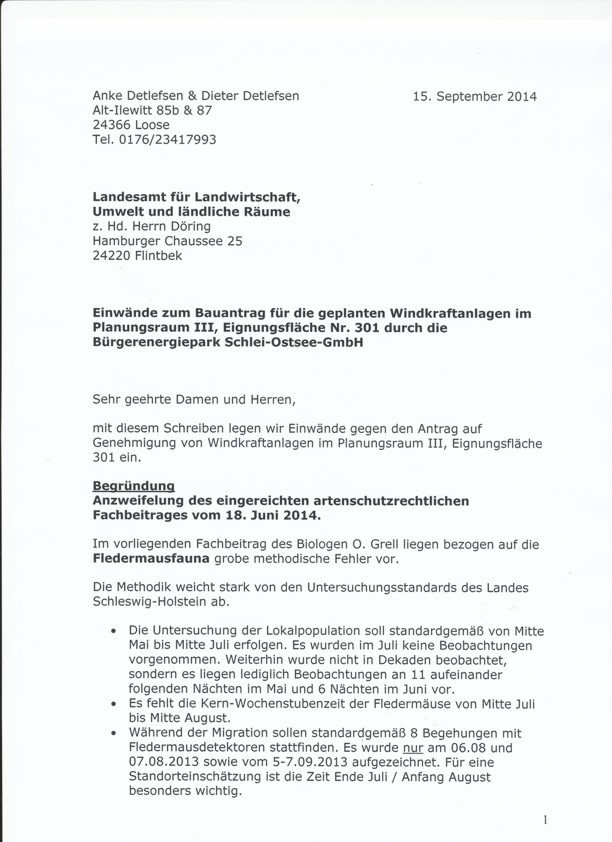 Schriftverkehr mit dem Landesamt für Landwirtschaft, Umwelt und ländliche Räume (LLUR) Anzweifelung des eingereichten artenschutzrechtlichen Fachbeitrages vom 18. Juni 2014